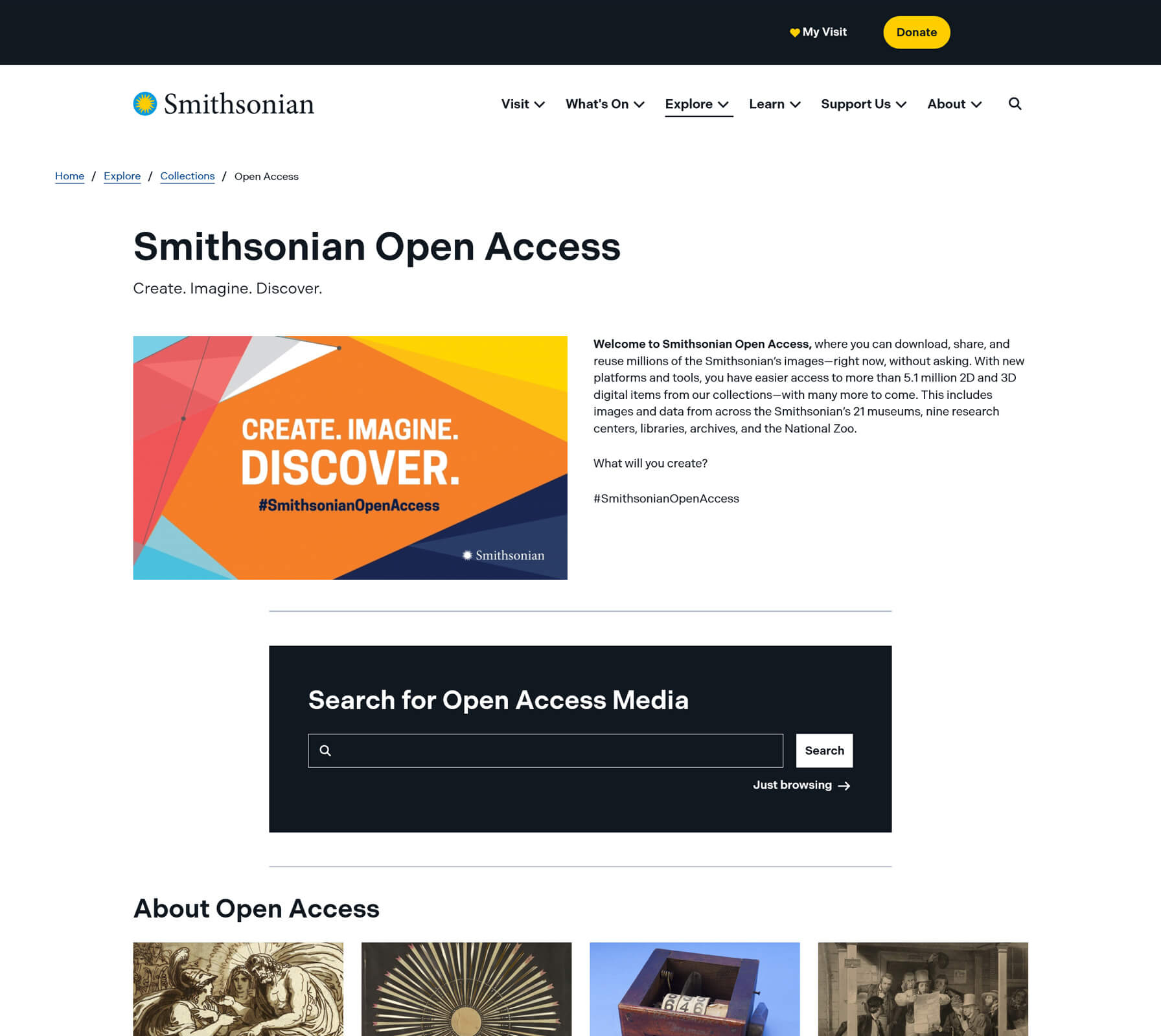 Smithsonian Open Access provides more than five million 2D and 3D digital items that the Smithsonian has dedicated to the public domain under CC0. The collection covers art, science, design, history, and culture from 19 museums, nine research centers, and the National Zoo, and all open access items can be downloaded and reused without permission. The initiative is managed centrally by the Smithsonian Institution as part of its digital strategy, and it explicitly uses the Creative Commons Zero public domain tools.