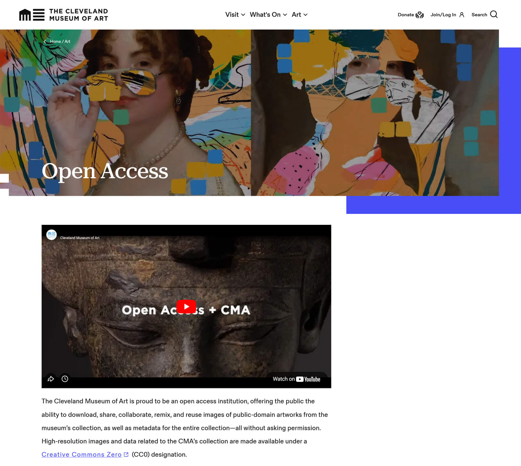 The Cleveland Museum of Art offers an Open Access program that makes high resolution images and metadata for a large portion of its collection available for unrestricted use. Open access items are clearly labeled and can be freely copied, modified, and commercialized. The program is run by the Cleveland Museum of Art, a major U.S. institution with a globally significant collection and a strong digital engagement strategy.