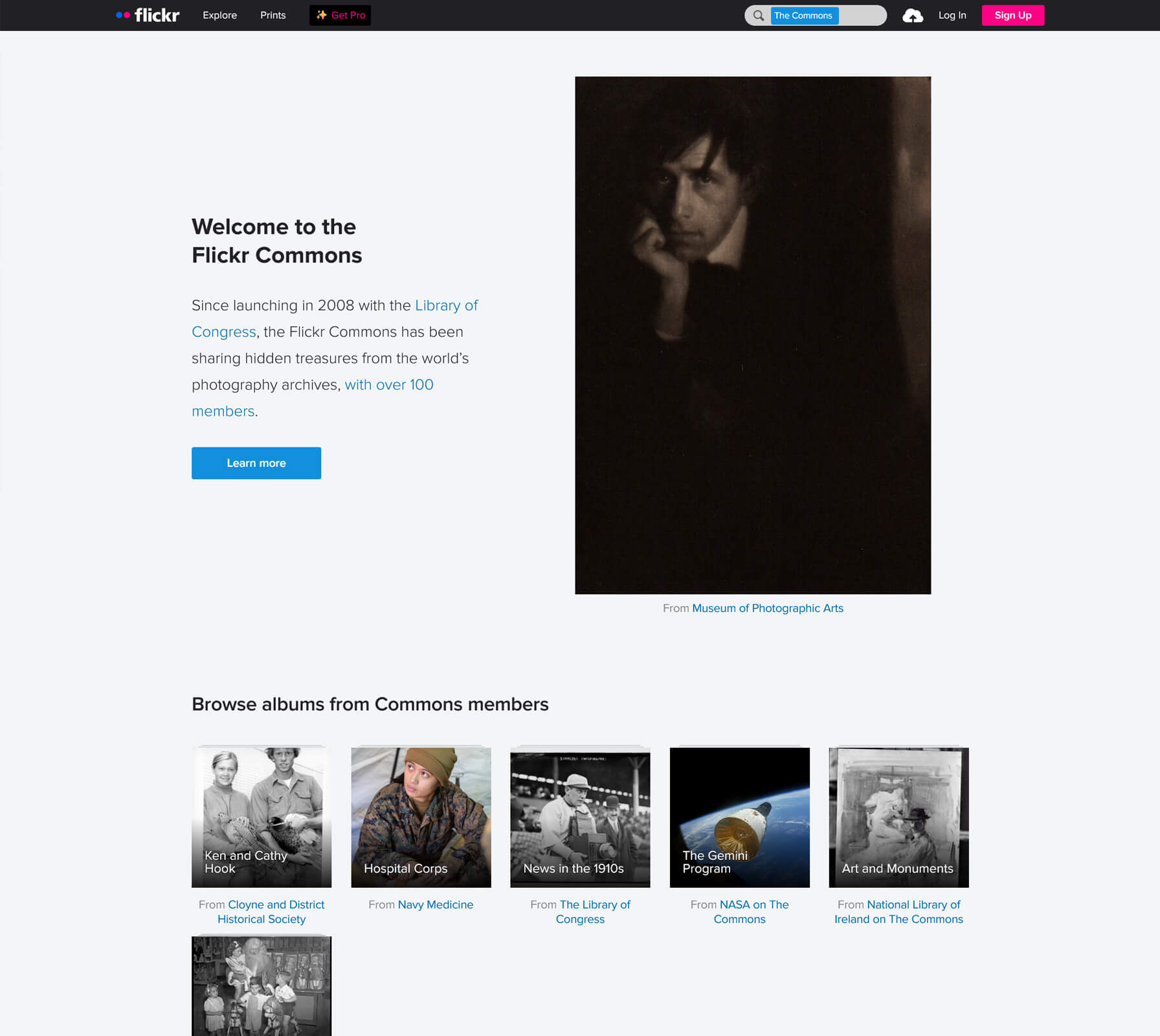 Flickr Commons hosts historical photography from more than one hundred libraries, archives, and museums that want to share public photo collections. The goal is to increase access to publicly held images and invite the public to tag and describe them, with many records labeled as having no known copyright restrictions. The Commons program was launched by Flickr in partnership with the Library of Congress and is now supported by the nonprofit Flickr Foundation together with participating institutions.