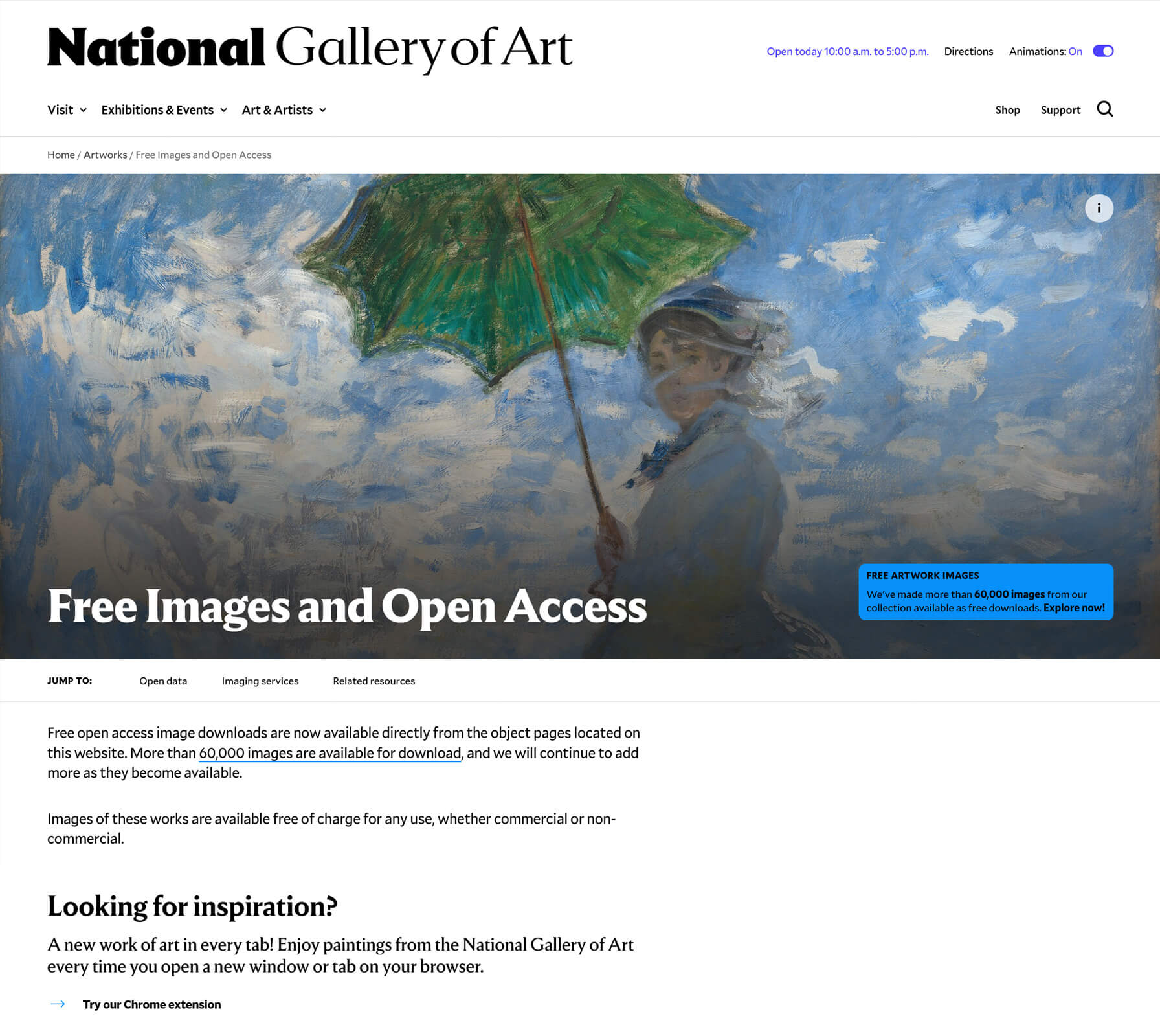 The National Gallery of Art in Washington, DC provides an Open Access program that includes hundreds of thousands of high resolution images of works in the public domain. These files can be downloaded without registration and used freely, including for commercial purposes. The open access initiative is managed by the National Gallery of Art, which also shares many of these images to Wikimedia Commons to broaden reuse.