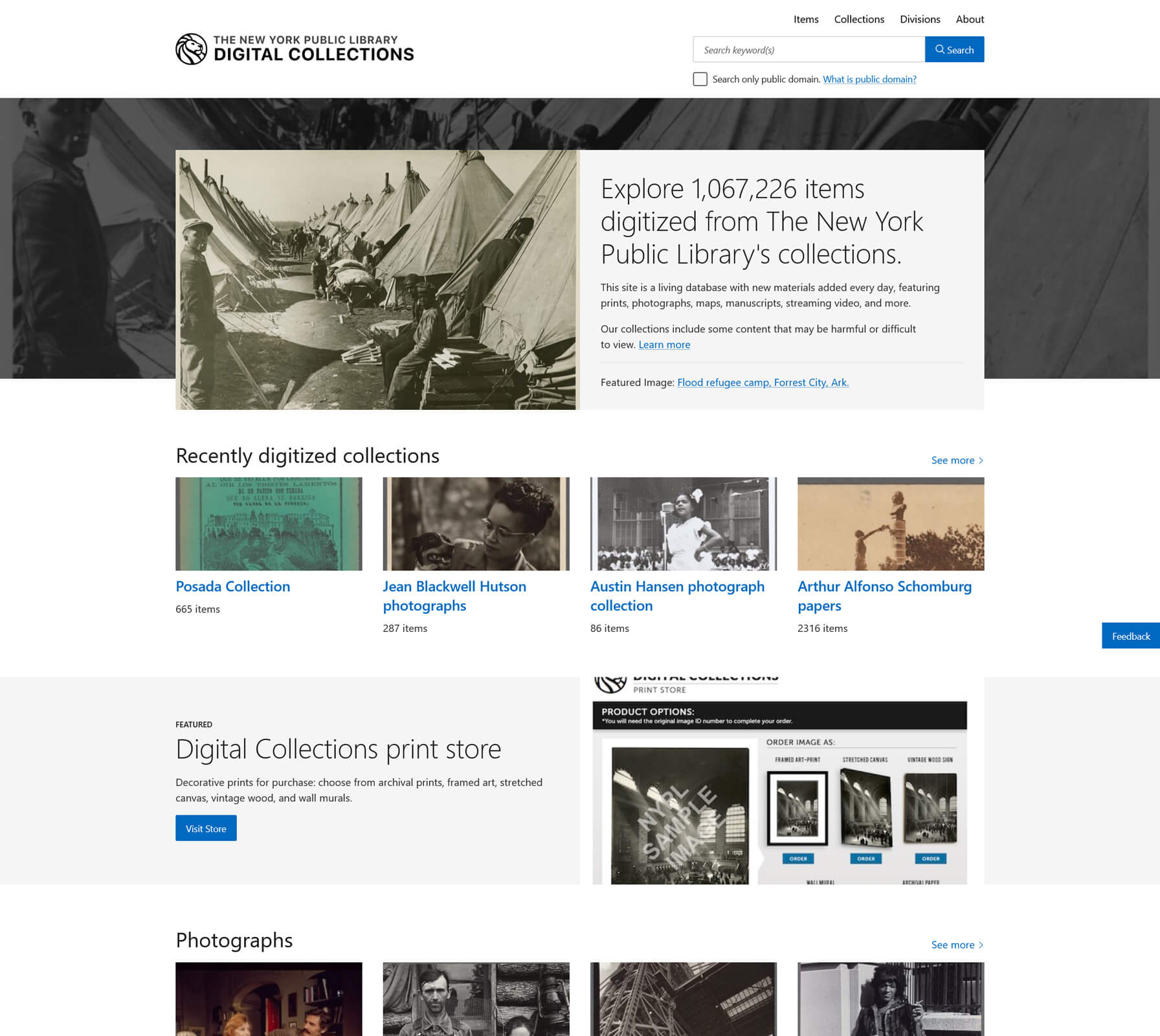 The NYPL Digital Collections include hundreds of thousands of items that the library has identified as public domain, from photographs and maps to illustrated books and posters. There is a dedicated view for public domain items, which can be downloaded in high resolution without sign-in. The site is operated by the New York Public Library, one of the largest public library systems in the United States.