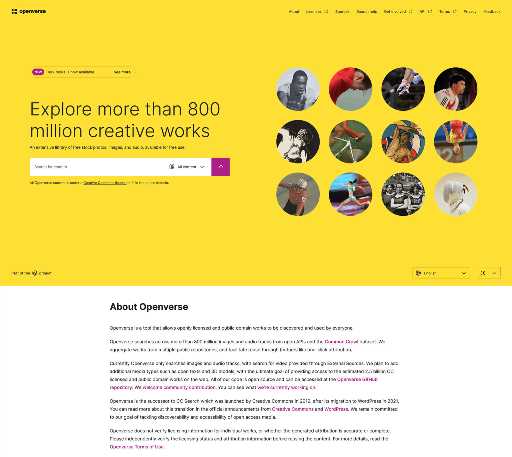 Openverse is a search engine that aggregates more than 800 million openly licensed and public domain images and audio files from dozens of sources. It lets you filter by license type, use case, and source so you can reliably find media suitable for commercial reuse. Openverse is a WordPress project stewarded by the WordPress Foundation and developed by the broader WordPress open source community.