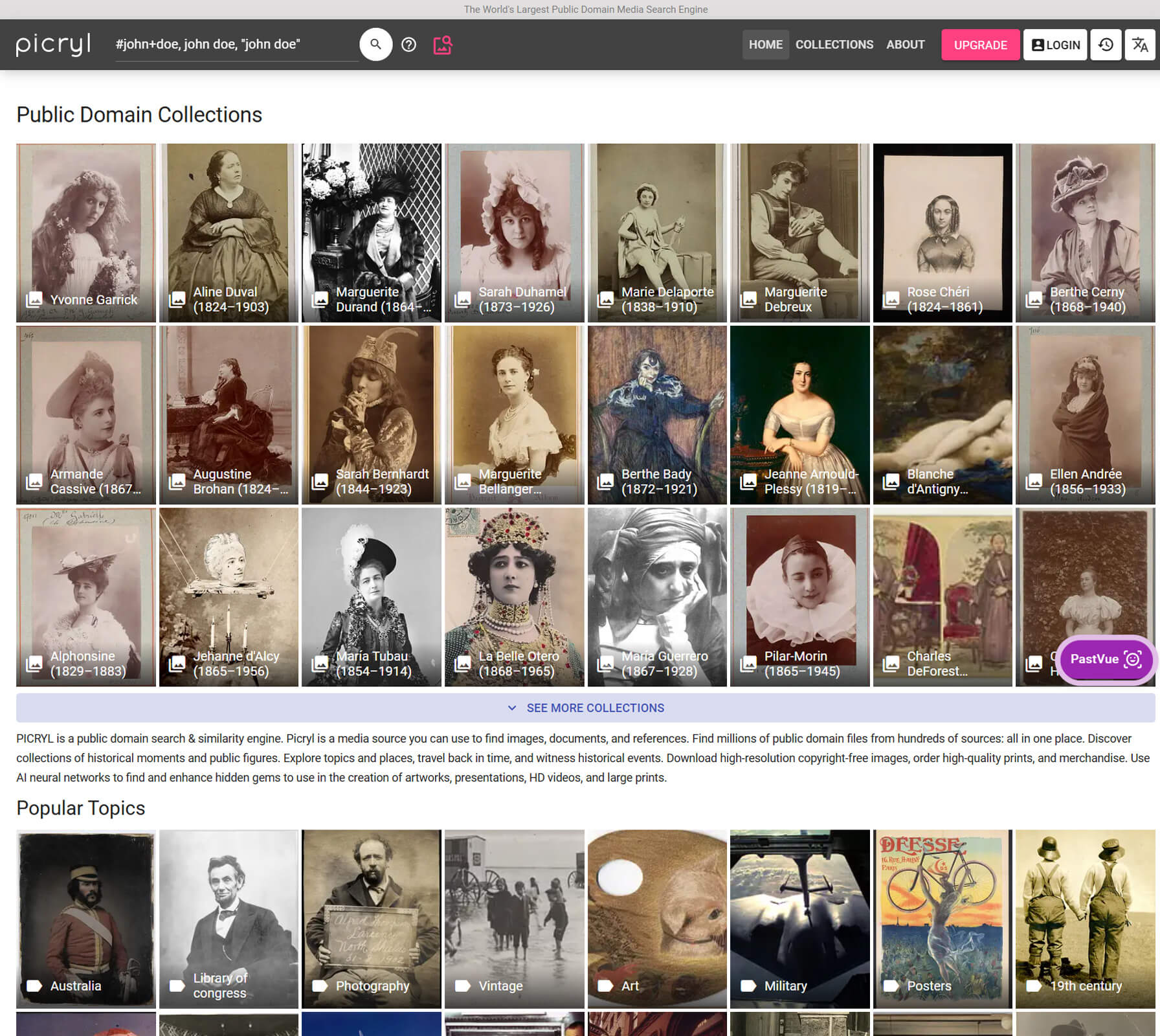 Picryl aggregates public domain images from many institutions and government archives into a single search platform. It is particularly strong for historical photographs, posters, and maps drawn from sources such as the Library of Congress and other national libraries. Picryl is developed and operated by GetArchive LLC, which markets it as one of the largest public domain image search engines available.