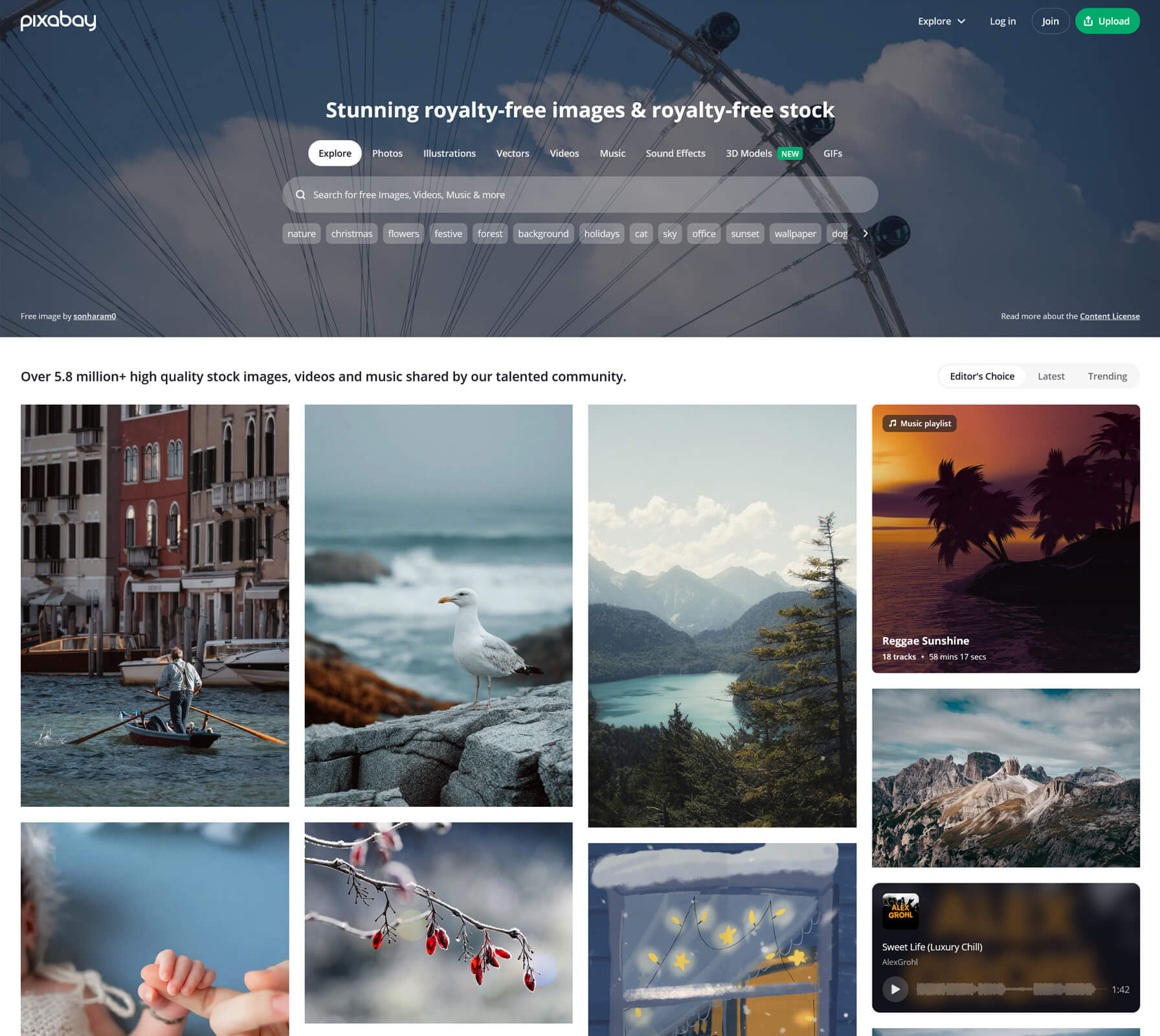 Pixabay is a very large free stock media library that now contains more than five million photos, illustrations, vectors, videos, and audio tracks. Although the site originally used the CC0 public domain dedication, most current material is available under a custom Pixabay Content License that still allows broad commercial reuse but restricts reselling unaltered files and certain sensitive uses. Pixabay operates as a brand of Canva Germany GmbH after being acquired by Canva, while continuing to run with its own site and community.