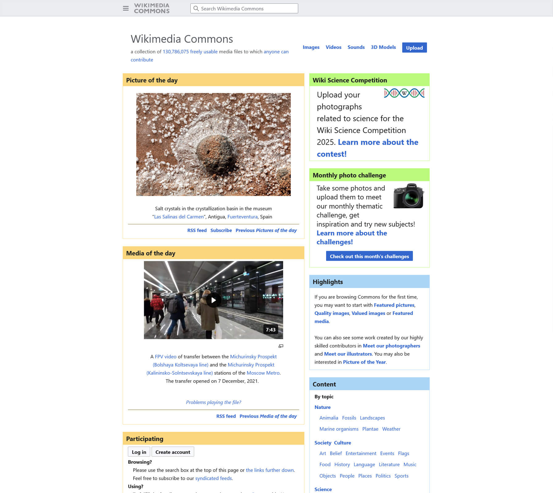 Wikimedia Commons is a huge free media repository with well over 130 million images, audio files, and videos under public domain or open licenses. It is especially strong for encyclopedic and cultural content, including contributions from many museums and archives. The site is operated by the nonprofit Wikimedia Foundation and populated and curated by a global community of volunteers.