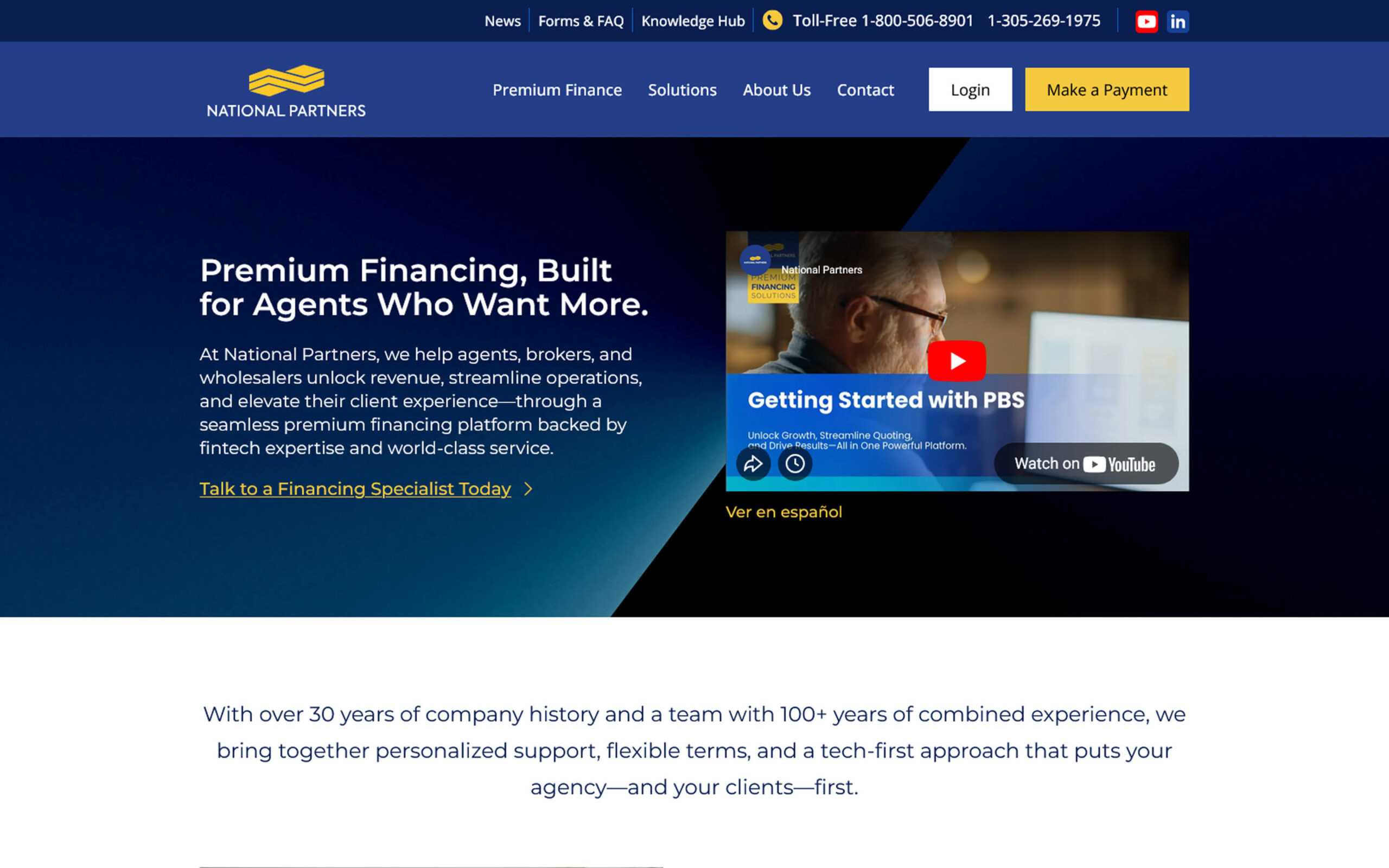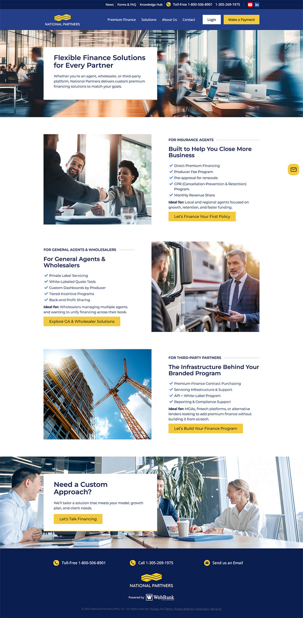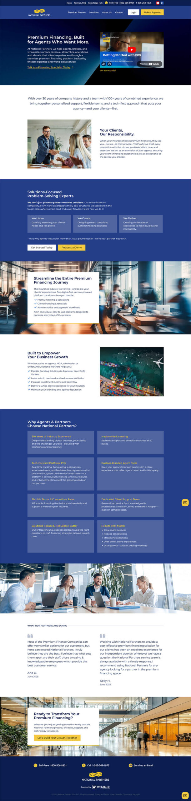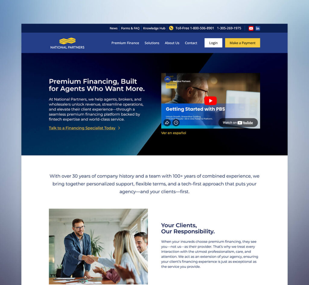 By aligning design, messaging, and conversion strategy, the National Partners website now reflects what the company already delivers in the market: smart premium financing, stronger partnerships, and a digital experience that works as hard as the team behind it.