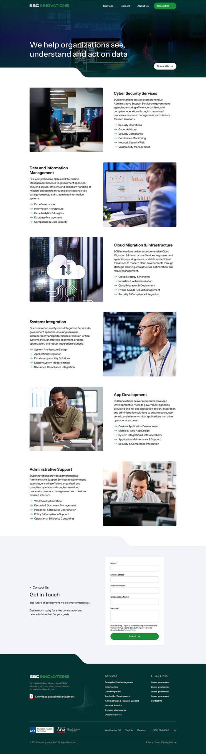 Each section was designed to deliver clarity and confidence: from showcasing federal success stories to providing an easy pathway for agencies to initiate contact or download the capabilities statement.